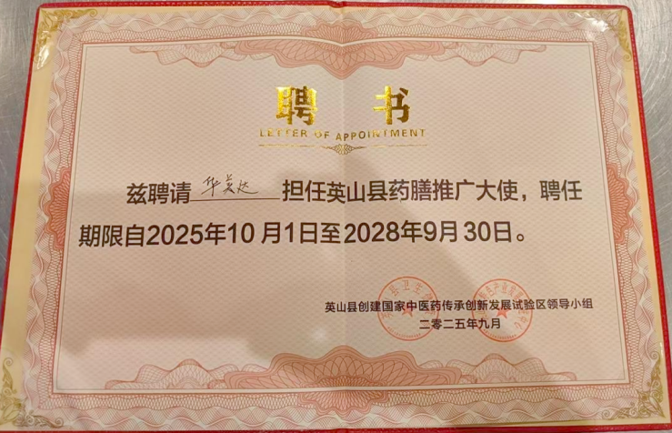 經英山縣創建國家中醫藥傳承創新發展試驗區領導小組決定,聘請英山華美達酒店為“英山縣藥膳推廣大使”,聘期自2025年10月1日至2028年9月30日。